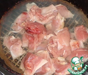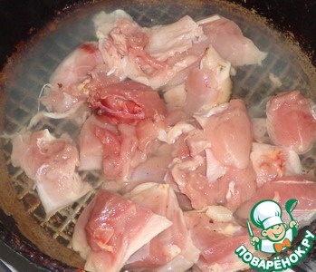 Выливаем воду в сковороду, добавляем крупные кусочки куриного мяса. Добавляем кориандр, соль, лавровый лист. Тушим под крышкой около 7 минут.