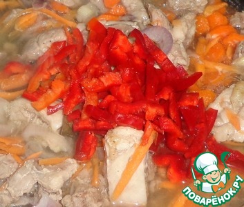 Перец порезать соломкой и добавить в сковороду. Тушим около 5 минут.