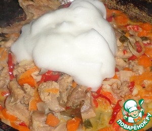 Добавляем сметану и тушим 3-5 минут. Затем добавляем измельченную зелень и перемешиваем.