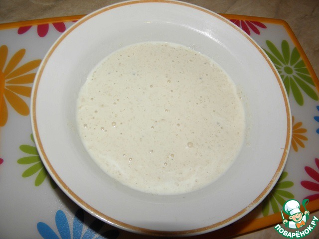 Тонкой струйкой влить молоко с яйцом в муку и замесить тесто. Оставить на 45 минут в теплом месте.. (тесто получается как жидкая сметана. -