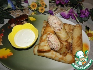 Завернуть блинчики (если блины большие, то конвертиком, и обжарить по 20 секунд на сковородке с обеих сторон (сначала швом вниз).., если маленькие, то трубочками.., можно не обжаривать)