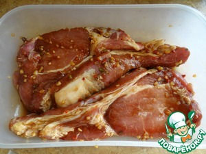 Пока готовится рис - приготовить мясо - куски свинины залить соевым соусом, приправить специями и оставить на 15 минут;