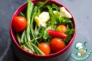 Подготовим все ингредиенты для соуса. Чеснок и имбирь очистим, зелень и овощи помоем. Используйте перец чили по вкусу, я кладу совсем небольшой кусочек, потому что сам перец очень острый попался. Соус в целом должен получится довольно острым.