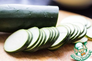 Цуккини нарезаем тонкими ломтиками.