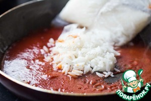 Кладем готовый рис в томатный соус, размешиваем и томим минуту.