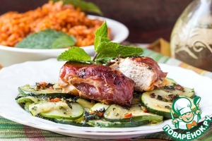 Свинина, фаршированная фетой, в хамоне с цуккини и томатным рисом. Свежий, легкий и в то же время сытный рецепт быстрого ужина! С фетой и хамоном свинина получается очень вкусной и интересной. Томатный рис и мятный острый цуккини идеально дополняют картину.