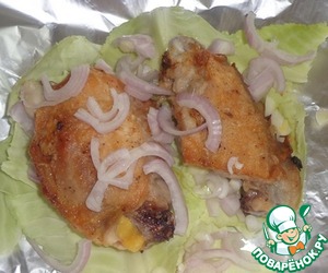 Куриные бедра, запеченные в фольге, на капустных листьях с репчатым луком. Подается данное блюдо к столу с лимонным "безе" и с клюквенным соусом D’arbo. Попробуйте и вам непременно понравится!