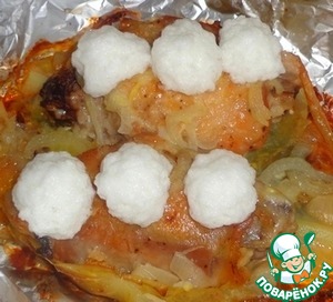 Достаем противень из духовки, разворачиваем фольгу и выкладываем лимонное "безе" на куриные бедра. Обратно ставим в духовку на 5 минут.