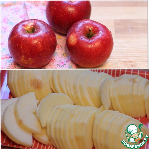В это время яблоки почистить от кожуры и сердцевины. Разрезать пополам и потом на полукольца примерно по 10 мл. в толщину.