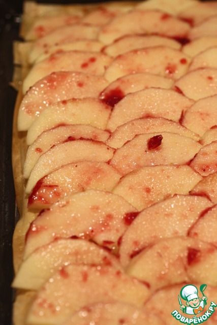 После того как наша основа испеклась выкладываем полукольца яблок и сверху смазываем их клюквенным соусом с сиропом. Посыпаем сахаром выпекаем 20 минут, до мягкости яблок! Приятного всем чаепития!