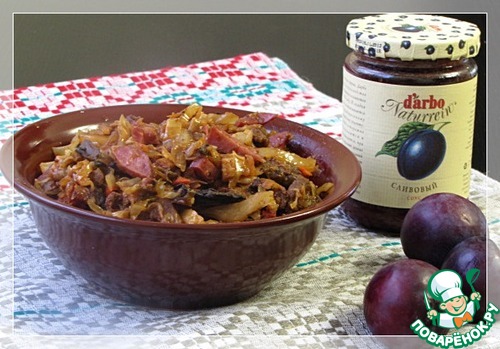 Бигос - известный рецепт польской кухни. Не пытаюсь открыть Америку. Но рецепт от Бориса Бурды, известного "знатока" и рассказчика, богат, заразителен. Примечателен этот рецепт еще тем, что вместо слив я использовала соус D’arbo Сливовый.