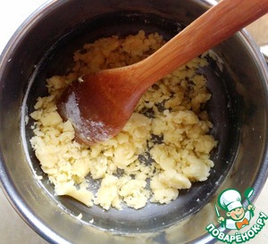 Введите в кастрюльку с мукой, перемешайте миксером. -