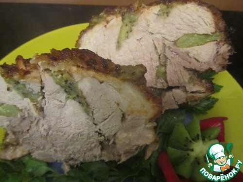 По всему кусочку мяса сделать надрезы - кармашки и нашпиговать его нарезанными дольками киви.