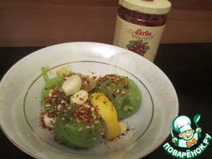 Подготовить продукты для маринада: очистить головку чеснока, дольку лимона взять вместе с кожурой, 3шт. очищенных киви, специи на ваш вкус (я использовала смесь для мяса из сушенных овощей с перцем чили), соус "Дикая брусника".