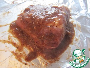 Расстелить на столе лист фольги, выложить на него нашпигованную свинину и залить готовым маринадом. смазать мясо со всех сторон.