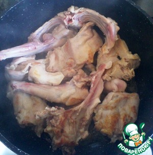 Кролика помыть, разделать на кусочки, обсушить.