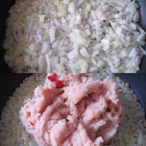 На сковороде пассеруем порезанные лук и чеснок до золотистого цвета. Затем добавляем к ним куриный фарш и готовим около 5-ти минут, помешивая.