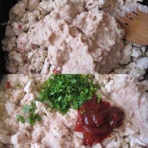 Начинку я сделала достаточно острой и солёной. Если начинка покажется жидкой, то можно ещё подержать сковороду на огне до выпаривания лишней жидкости или загустить начинку при помощи хлебных крошек или панировочной смеси. Начинка готова, даём ей остыть.