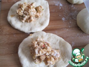 Из каждого шариками руками или скалкой формуем лепёшки, на середину каждой лепёшки выкладываем начинку. У меня уместилось по две чайные ложки с горкой. Защипываем и формируем пирожки.