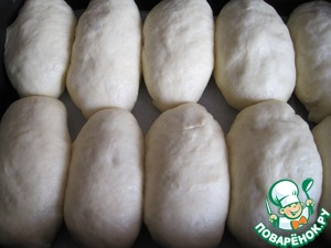 Сформированные пирожки выкладываем плотно в форму, выстланную бумагой для выпечки. Накрываем форму полотенцем и оставим в тёплом месте на 20-25 минут до увеличения пирожков в объёме. Духовку включаем разогреваться t 190-200 градусов.