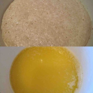 В тёплом молоке с сахаром оживляем дрожжи до появления пенной шапочки. Сливочное масло растопим и даём ему остыть до тёплого.