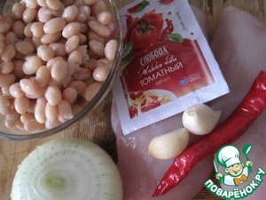 Пока тесто подходит, приготовим начинку. С куриной грудки снимаем филе (можно взять готовое филе), с фасоли сливаем жидкость, лук и чеснок мелко режем.