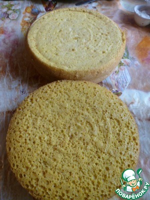 Сначала нужно испечь два бисквита. Я делала это заранее, за сутки до сборки торта.