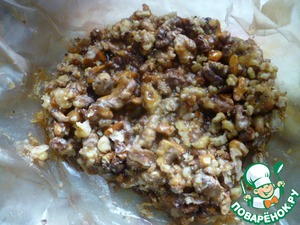 1 стакан орехов обжарить на сухой сковороде, добавить 1 стакан сахара и помешивая, довести до полного растворения сахара и карамельного цвета.