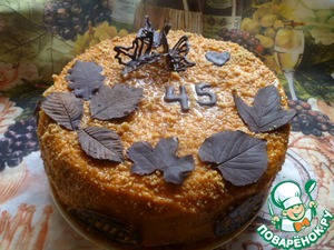 Смазываем погуще еще раз верх и бока торта тыквенным кремом, посыпаем грильяжем и украшаем шоколадными украшениями. -
