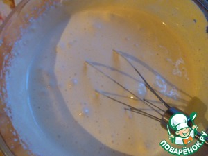 3 желтка взбить с 1 стаканом сахара, добавить 150 мл молока, затем просеять 4 столовые ложки какао и 8 столовых ложек муки.