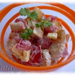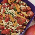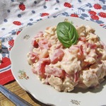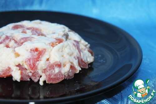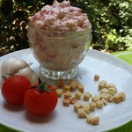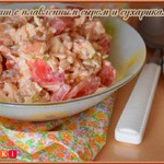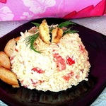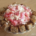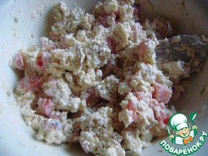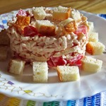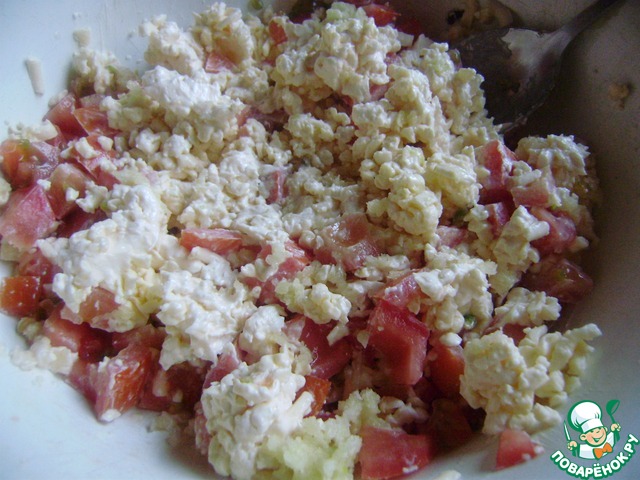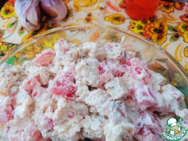 Помидоры бланшировала и удалила семечки,плавленный сыр был козий,добавила молотый чёрный перец,сухарики были со вкусом крабов(но этот вкус не чувствовался), из пакетика.