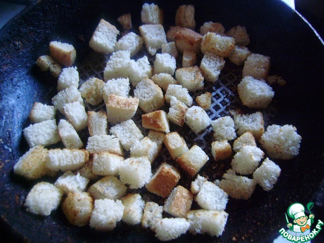 Хлеб нарезаем кубиками и сушим сухарики на сухой сковороде. Можно уже купить готовые, но домашние куда вкуснее.