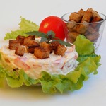 В салат добавляем майонез и сухарики. Салат готов. По желанию можно украсить зеленью.