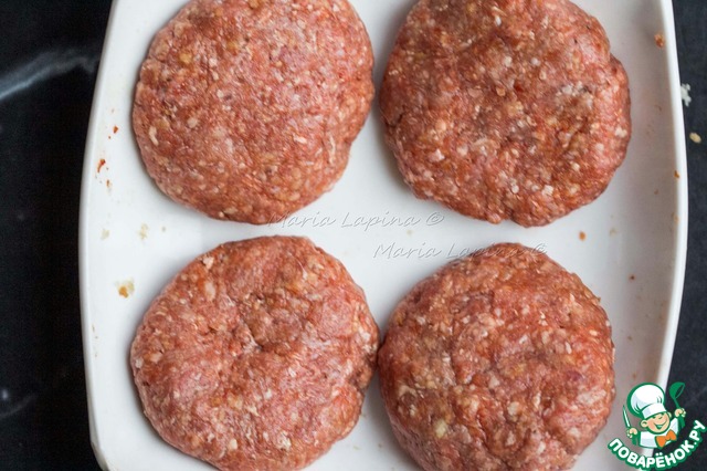 Вымешать фарш, разделить на 4 части и сформировать плоские котлетки. Обжарить котлеты на растительном масле с двух сторон до румяности.