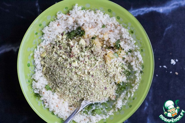 Котлеты переложить в форму или на противень. Сверху выложить фисташковую смесь. Немного придавить, поставить в духовку на 10-15 минут при температуре 200С.