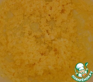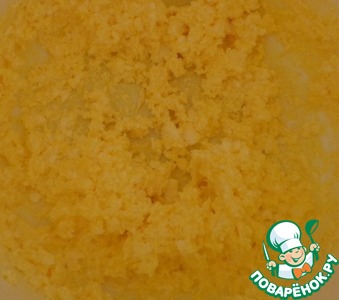 Для начала приготовим основу для пирожных. Для этого необходимо соединить желтки со сливочным маслом и взбить с помощью миксера около 1 минуты. Затем добавляем сахар, соду гашеную уксусом. Перемешиваем. -