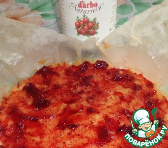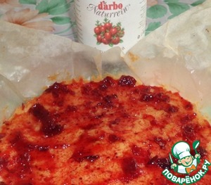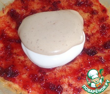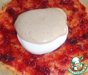 Готовый и остывший корж смазываем клюквенным соусом, который затем придаст пирожному кислинку.