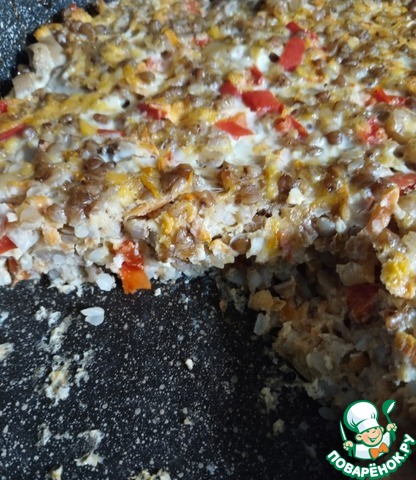 Гречку не варила. Залила теплой водой, пока делала пережарку она чуть набухла, потом в нее добавила остальное, перемешала и запекла. Форма 26”
