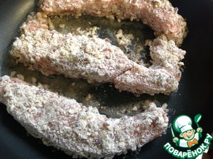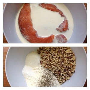 Вытащить из сливок рыбку и обвалять в орехово-мучной смеси. Обжарить семгу на средне-сильном огне в сковороде с добавлением оливкового масла. На обе стороны затратить не более 5 мин