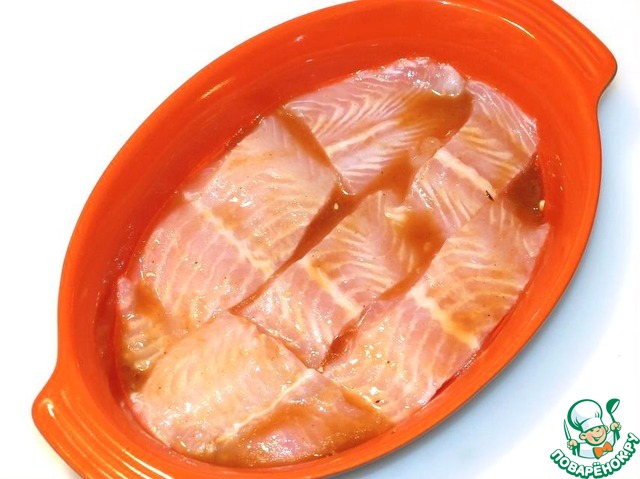• Заливаем рыбу маринадом и даем постоять минут 5-8. Можно посыпать рыбу кунжутными семечками и отправить в хорошо разогретую до 230 градусов духовку на 10 минут.