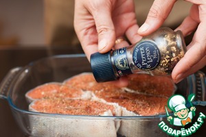Рыбные стейки укладываем в форму для запекания, немного перчим