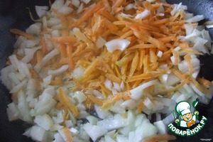 Лук порезать мелкими кубиками, морковку натереть на терке. В сковороду налить растительное масло, выложить лук и морковь и немного обжарить.