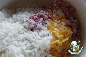 Выложить фарш в миску, добавить часть, примерно, половину, лука с морковкой, рис отварной, соль и специи.