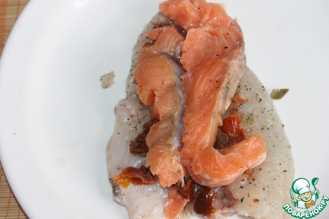 Филе дорадо укладываю кожей вниз, на него намазываю кашицу из вяленых томатов и каперсов, сверху филе семги