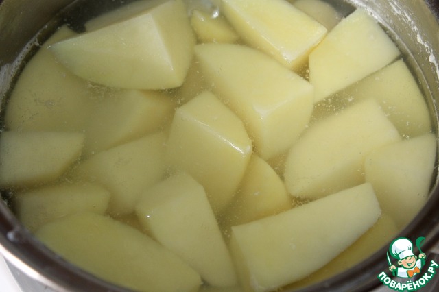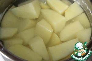 Картофель почистила и отварилав подсоленой воде. А для ускорения процесса я его порезала на небольшие кусочки.
