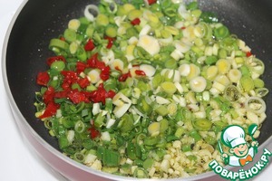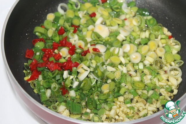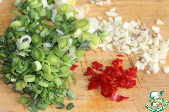 Подавать с бурым рисом на гарнир, присыпав его хлопьями перчика чили