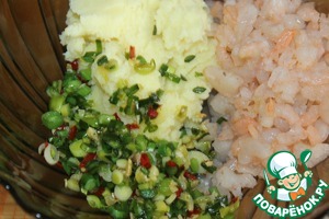 Смешать картофель, креветки и обжаренные перец, лук и чеснок. Поперчить и отрегулировать на соль