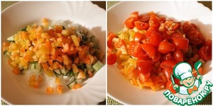 • Болгарский перец так же нарезать кубиками, помидоры черри нарезать на четвертинки.