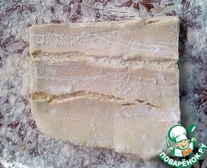 - Тесто слоеное бездрожжевое (у меня было скрученное в рулет тесто, я взяла половину от него) — 1/2 пач.