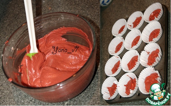 Аккуратно вмешать получившуюся массу в сухие ингредиенты (шаг №2). Разлить тесто на 1/3 в бумажные формочки для мафинов, положить по 1 вишне в мафин. Выпекать 20 мин. при 175 C или до готовности кексов.